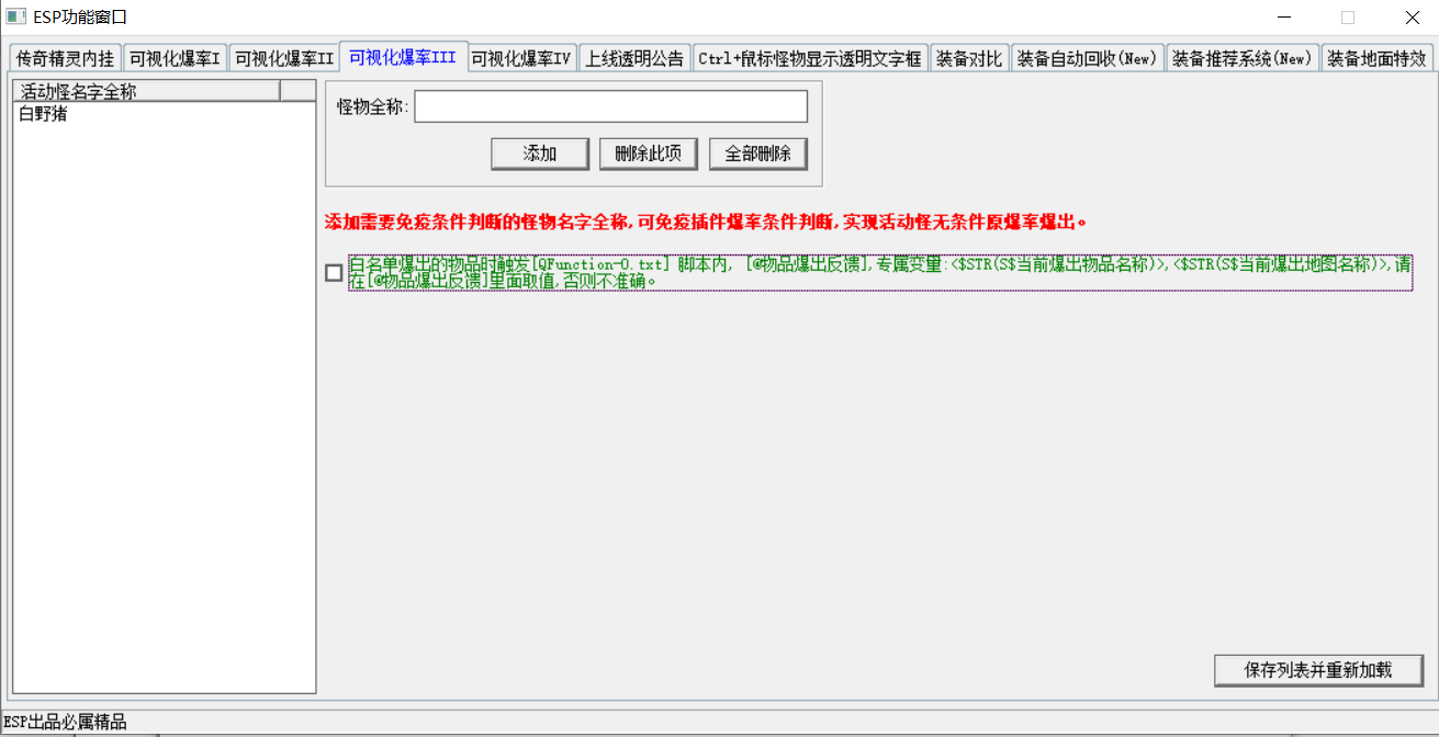可视化爆率III用于过滤活动怪,填写需要过滤的怪物全称,那这个怪物所爆的装备都不会走条件判断