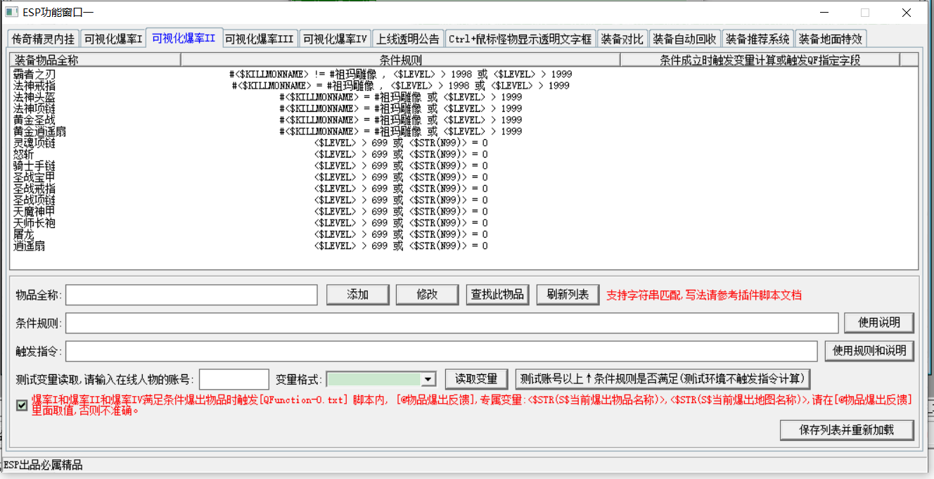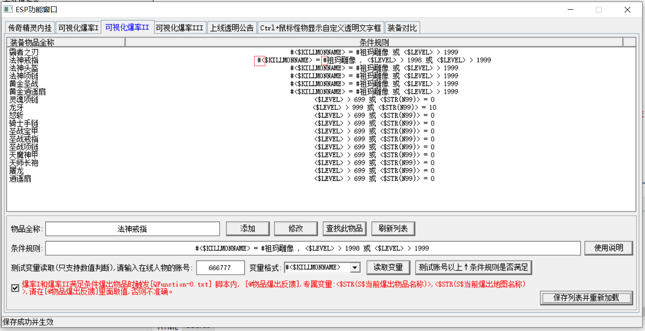 另外可视化爆率II里面提供了读取变量、测试条件规则的按钮,可方便新手进行快速调试测试